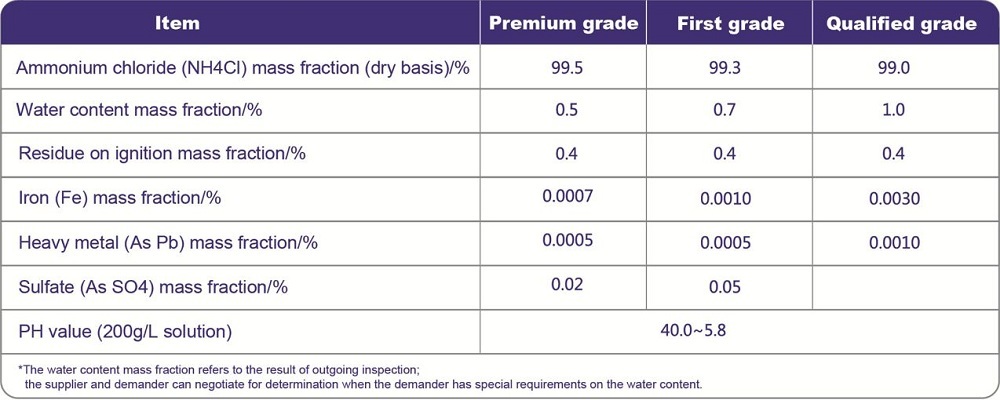 Product features: White powder or granular crystals, odorless, salty and refreshing in taste; easily absorbing moisture and caking, easily soluble in water, soluble in glycerol and liquid ammonia, difficult to be dissolved in ethanol, insoluble in acetone and ether; subliming at 350°C, its aqueous solution with weak acidity.