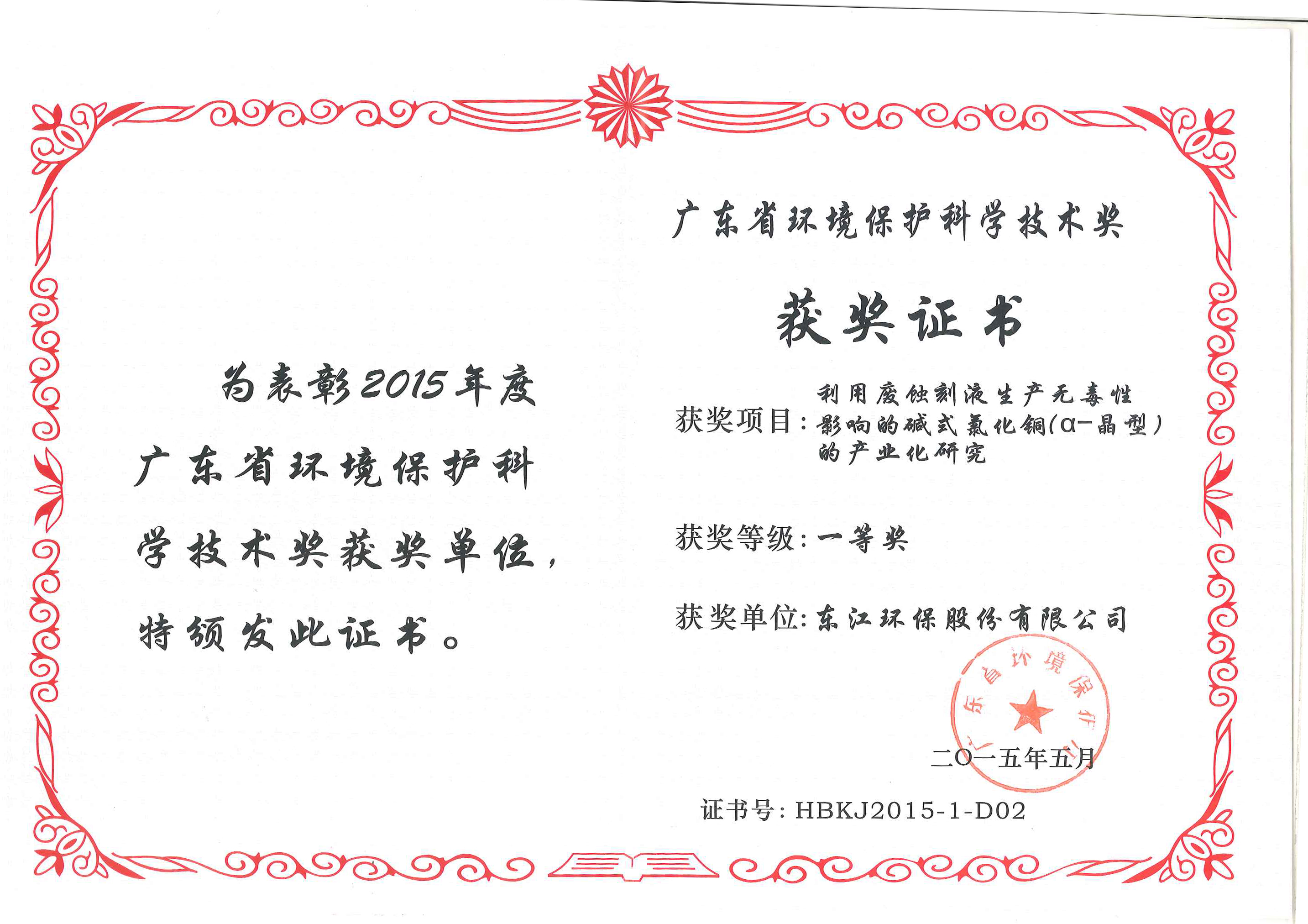 2015年5月 廣東省環境保護科學技術獎(利用廢蝕刻液生產無毒性影響的堿式氯化銅的產業化研究一等獎)