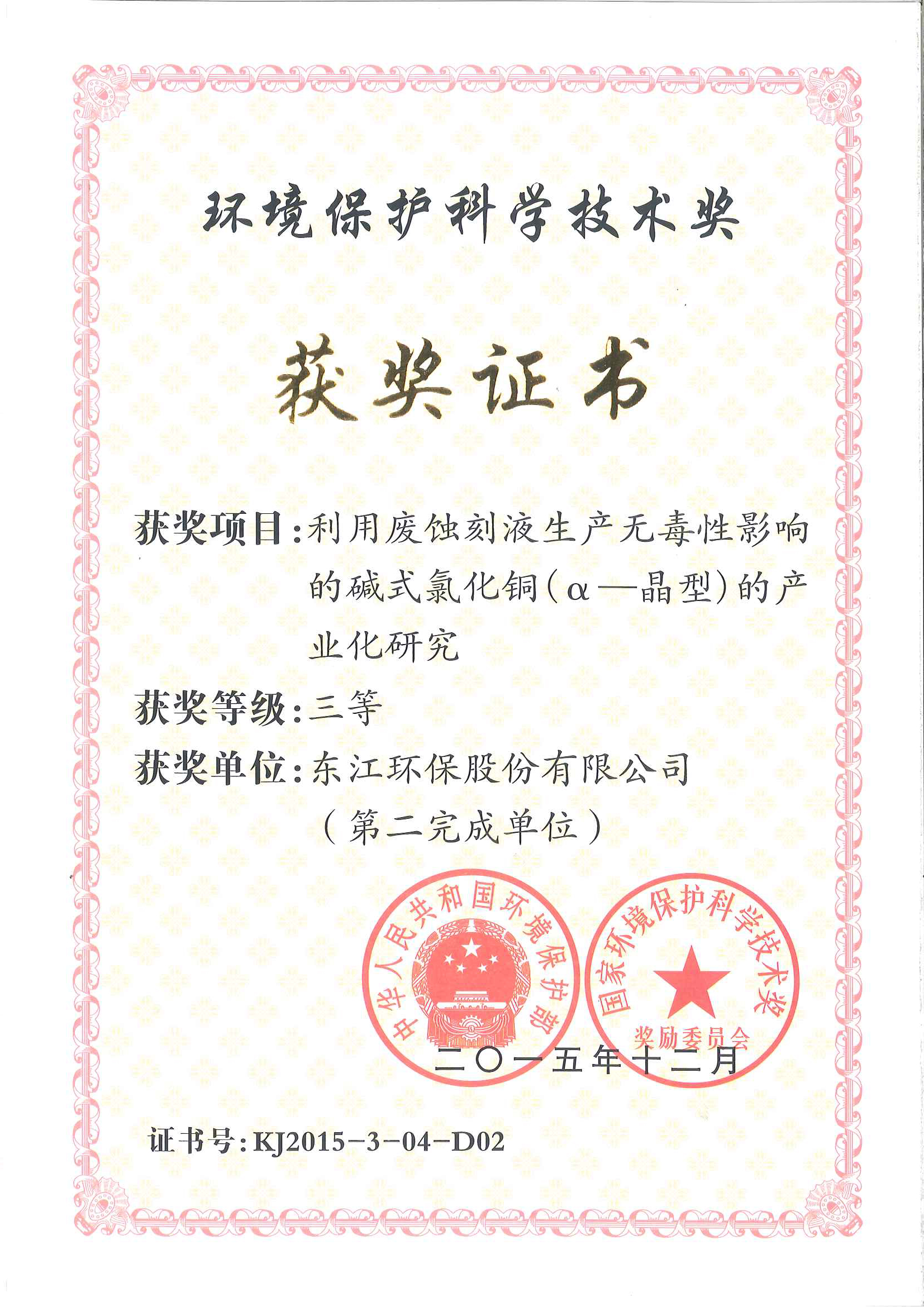 2015年12月 環境保護科學技術獎三等獎【利用蝕刻液生產無毒性影響的堿式氯化銅(α-晶型)的產業化研究】