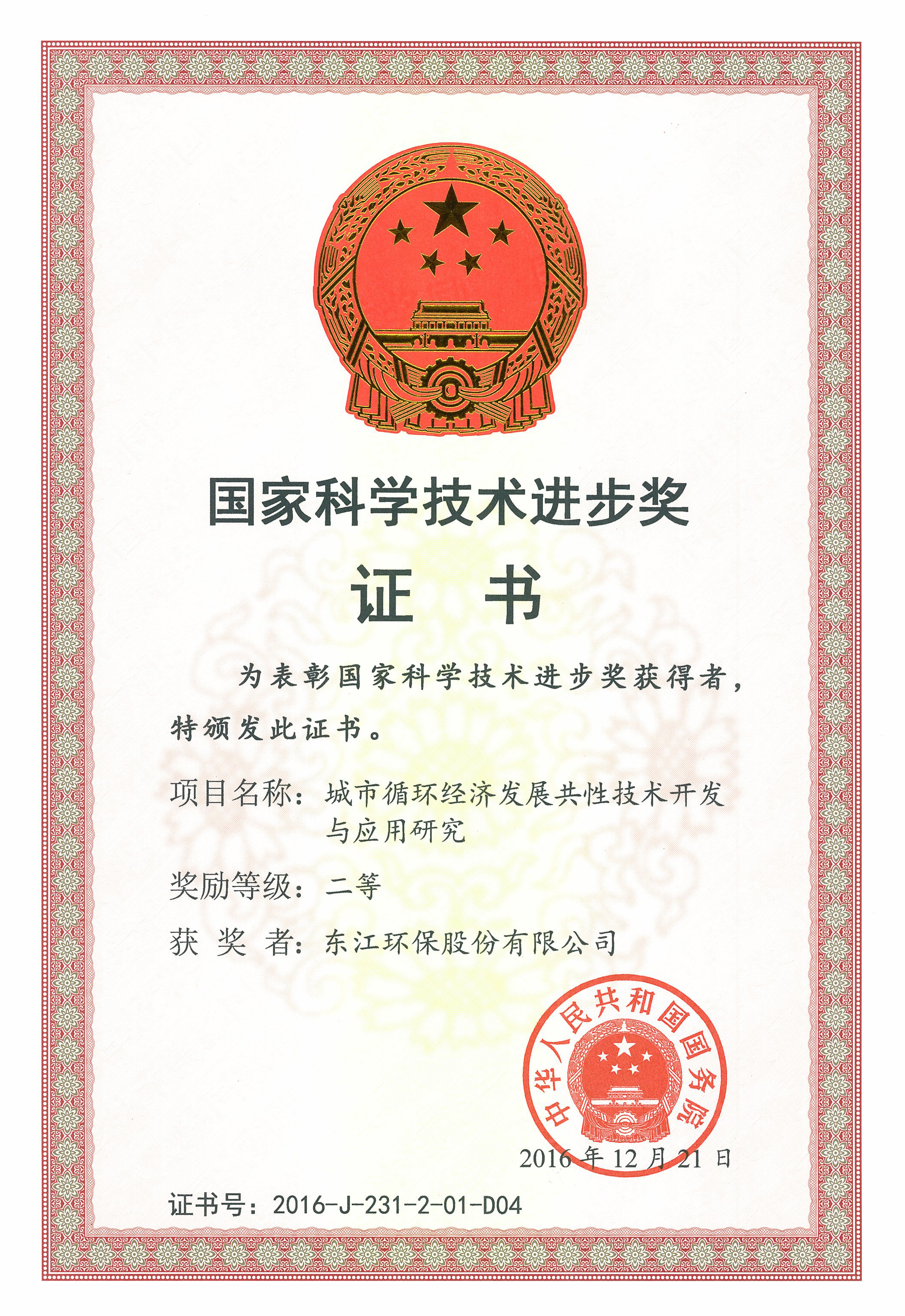 2016年12月 國家科學技術進步獎二等獎(城市循環經濟發展技術開發與應用研究)