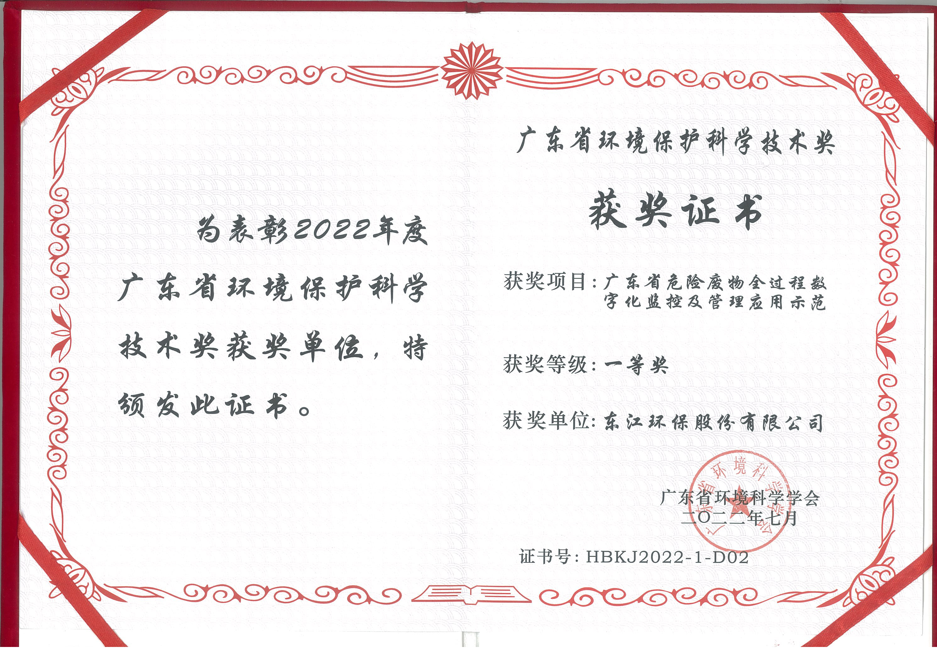 2022年7月 廣東省環境保護科學技術獎一等獎(廣東省危險廢物全過程數字化監控及管理應用)